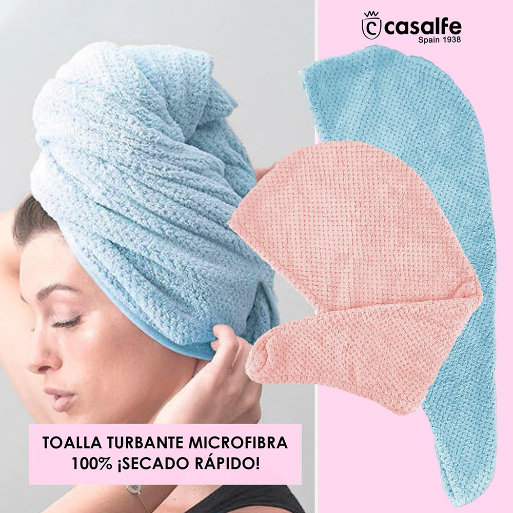 Prosop turban din 100% microfibră, moale și plăcut la atingere. Este prevăzut cu buton de ajustare, pentru menținerea fixă a părului. Datorită țesăturii sale, absoarbe rapid umezeala din păr, reducând timpul de uscare.